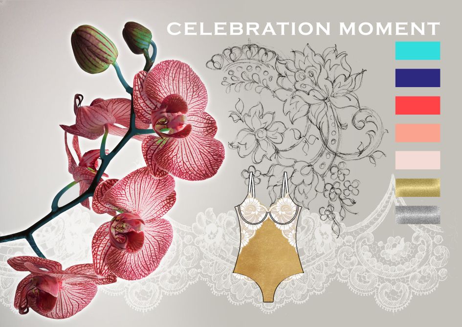 -CELEBRATION MOMENT: IT IS THE TIME TO CELEBRATE, TO EXPRESS OUR POSITIVE ENERGY, TO SHOW OFF OUR BEAUTY. IN THIS TREND WE HAVE DEVELOPED FESTIVE, LUXURIOUS, EXUBERANT DESIGNS BECAUSE ANY DAY IS A REASON TO CELEBRATE. THE COLOUR PALETTE IS BRIGHT, BUT ALSO INCLUDES SOFT, FEMININE TONES. NATURALLY WITHOUT FORGETTING BLACK AND WHITE.