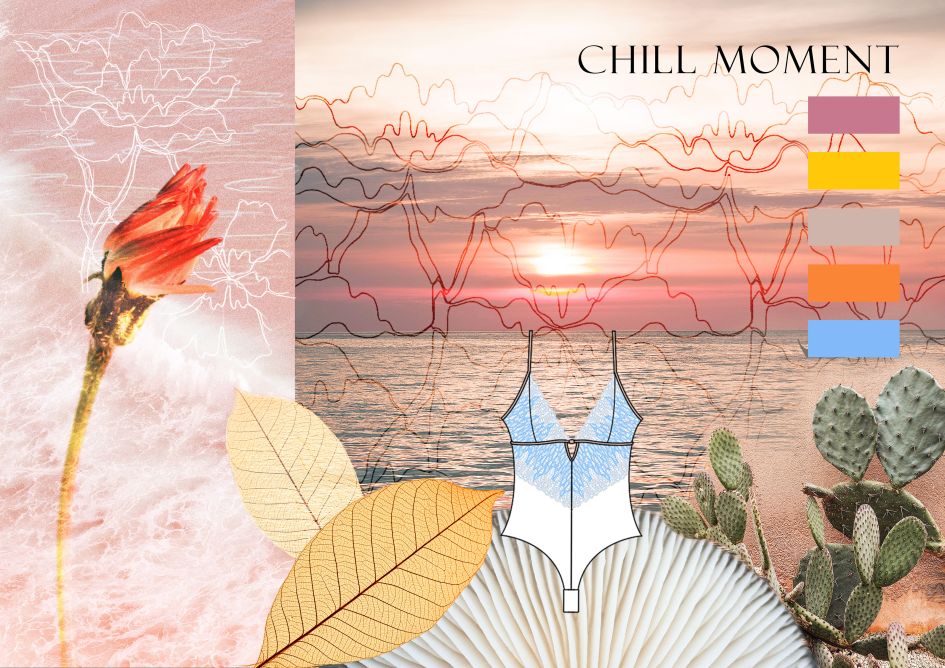 -CHILL MOMENT: REFERS TO THE NECESSARY MOMENT OF RELAXATION. IT IS BASED ON THE SENSATIONS THAT THE CONNECTION WITH NATURE TRANSMITS TO US. THE CONTACT WITH THE SAND ON THE BEACH, THE CRASHING OF THE SEA WAVES, THE TEXTURES OF TREES AND PLANTS, THE COMFORT OF NATURAL MATERIALS SUCH AS COTTON. ALL PRESENTED IN A RANGE OF CALM BUT CHEERFUL COLOURS.