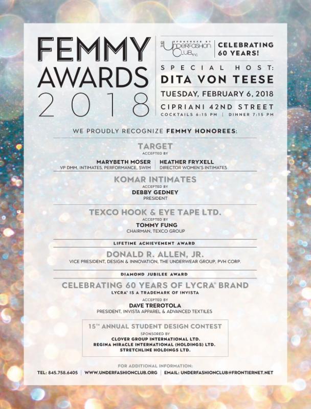 In 2004, the Club sponsored its first Student Design Contest featuring the work of Fashion Institute of Technology seniors with an intimate apparel specialization. Since 2006, the contest has been an integral part of the Femmy Gala, highlighting the Club’s commitment to “education today for a better industry tomorrow,” and providing significant cash awards to the winners, thanks to the generosity of companies such as Clover Group International, Regina Miracle International, and Stretchline Holdings Ltd.