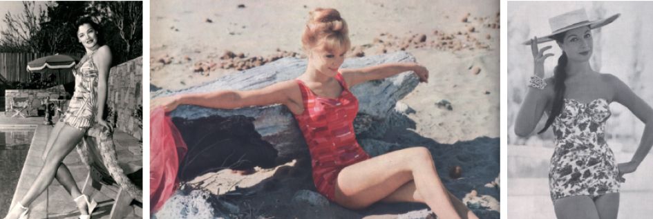 The skirt-swimsuit is one of the 1950s biggest successes. Intended to give swimmers a little more coverage, it had the advantage of also being suitable to wear to the swimming pool bar or in the hotel gardens. The swimsuit was no longer just for swimming but also became beach or cocktail attire, perfect for Pool Parties. A flamboyant swim fashion was very much a hit during this decade. Prints and spangled costumes were very much in style and suits were often decorated with buttons, faux lacing, belts and large pockets. The skirt could be straight, slightly open, wrap skirt style or cut short.