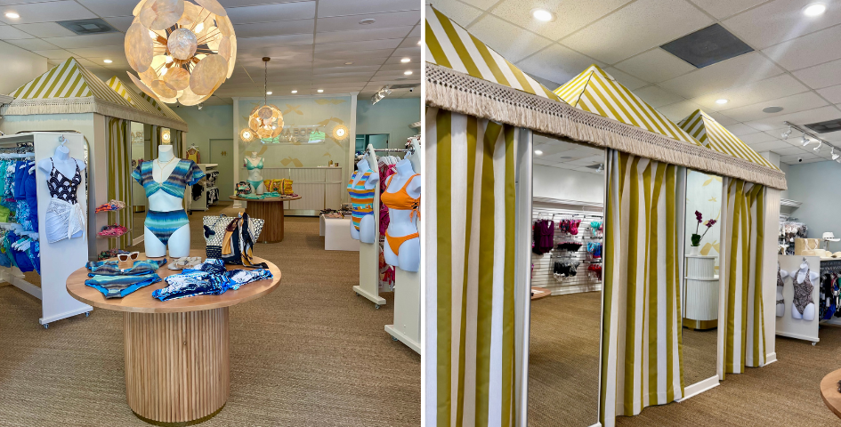 The boutique’s interiors channel the timeless elegance of European beach clubs, with seafoam hues, shell-inspired lighting, and airy, cabana-style dressing rooms that evoke a sun-drenched getaway. From a whimsical beach ball pillow to a vintage-inspired wicker bar cart, each design element creates a space that feels like a chic escape. With its upscale selection the boutique offers a diverse, inclusive range of styles and sizes; from the bold prints, flattering cuts, and vibrant energy of Maaji and Beach Riot, to more classic silhouettes by brands such as Seafolly, and Jantzen. The carefully curated selection empowers every woman to feel confident and beautiful—on the beach, by the pool, or simply soaking up a sunny Louisiana afternoon.