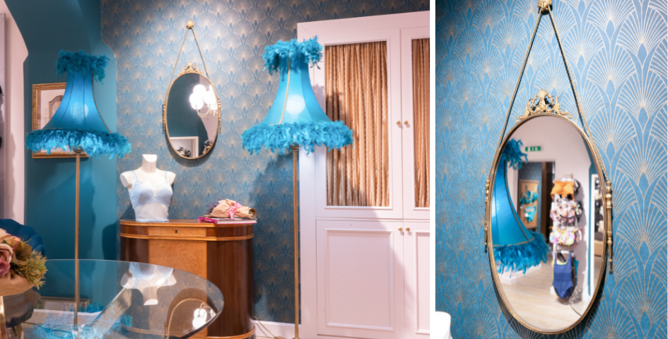 The new design captures the era's timeless glamour, seamlessly blending modern Deco-style furniture with authentic antique pieces. Every detail reflects the distinctive aesthetics of Art Deco: bold color contrasts (peacock blue and teal paired with pale pink and gold), geometric shapes (from spherical light fixtures to intricate wallpaper patterns), and gleaming golden brass accents. A custom counter perfectly completes Adriana's vision, while her thoughtful overhaul of the lighting, featuring track and spotlights, enhances both function and ambiance. The result is a chic, inviting space that not only showcases the store's exceptional products and service but also strengthens its unique identity. Bravo!
