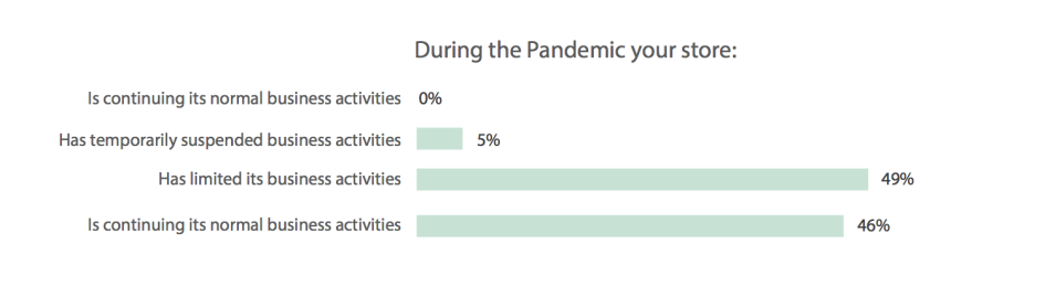 Throughout North America, as in all countries around the world, in 2020 stores mobilised to adhere to government and state regulations concerning the measures to be taken to curb the pandemic. This has inevitably varied from region to region, causing some stores to have to shut down for up to three months and others to continue business almost as usual, while applying the necessary health precautions of course. Despite the fluctuations of the pandemic, stores have been very active in finding strategies to ensure continuity of operations. Translated in numbers, 46 % of stores interviewed stated that they were continuing normal business activities; 49% told us that they had limited their business activities and only 5% had temporarily suspended business activities. No store reported they would be permanently stopping business although some companies did see themselves having to close some of their locations.