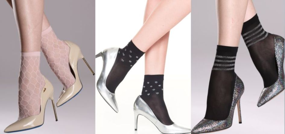 The socks range from fishnet to classic, to the most romantic and feminine styles; graphic patterns in pastel colors with hearts, stars and polka dots presented on similar or contrasting colors.
