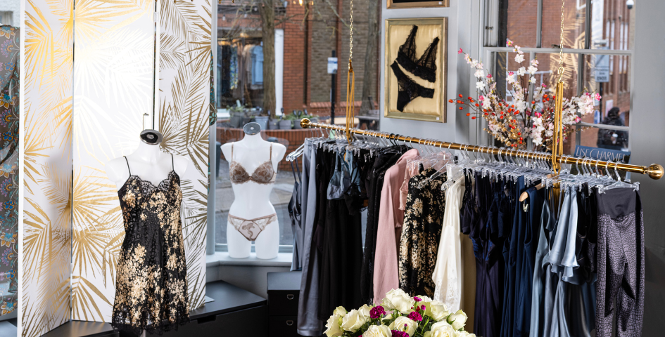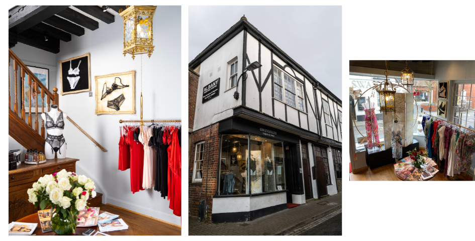 Nestled in a very characteristic half-timbered building, customers are welcomed into an ambience with a distinctly "British" decor. The selection of high-end articles displayed in golden frames, or on delightful brass racks, blend in harmoniously with the antique chandeliers. Bouquets of flowers, bought fresh every day, and luxury fitting rooms, contribute to create a feeling of well-being for customers to relax in. Private fittings (also post-operative) and a home delivery service have contributed to strengthening the store’s relationship with existing clients, while fashion shows and a good social media presence attract the attention of new clients fascinated by this elegant celebration of femininity.