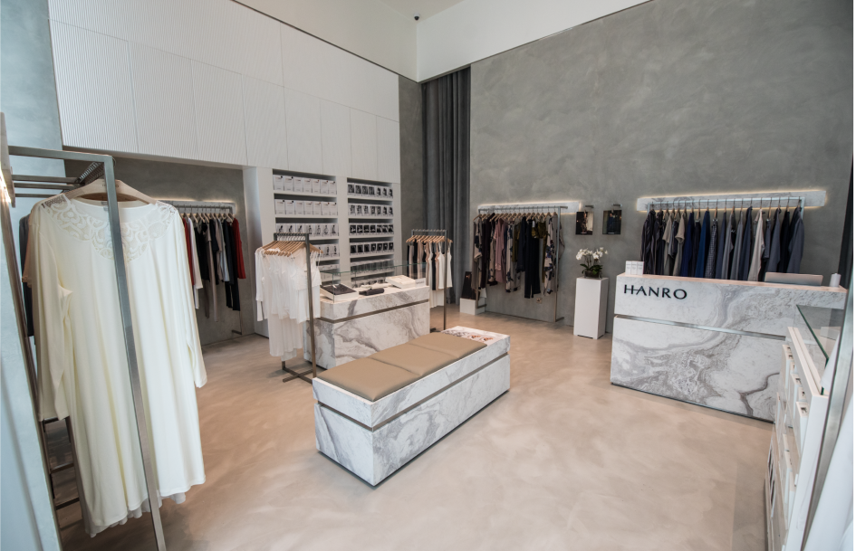 Founded in 1884 in a small Swiss town, Hanro has developed a strong reputation for excellence in lingerie, nightwear and loungewear, and has expanded across the world. Its latest flaship store can be found in the new Fashion Avenue of the Dubai Mall, one of the world’s largest premium shopping centers. The store, which is set over 750 square feet (70 square meters) and boasts soaring 20-foot (6-meter) ceilings, offers a full selection of womenswear and menswear from across Hanro’s collections. Whilst also targeting the many tourists and business travelers that frequent the mall, the store is primarily aimed at a local clientèle. The décor is inviting and luxurious at once, with design details such as the indirect lighting and marbles counters making the spacious salesfloor intimate and relaxed.