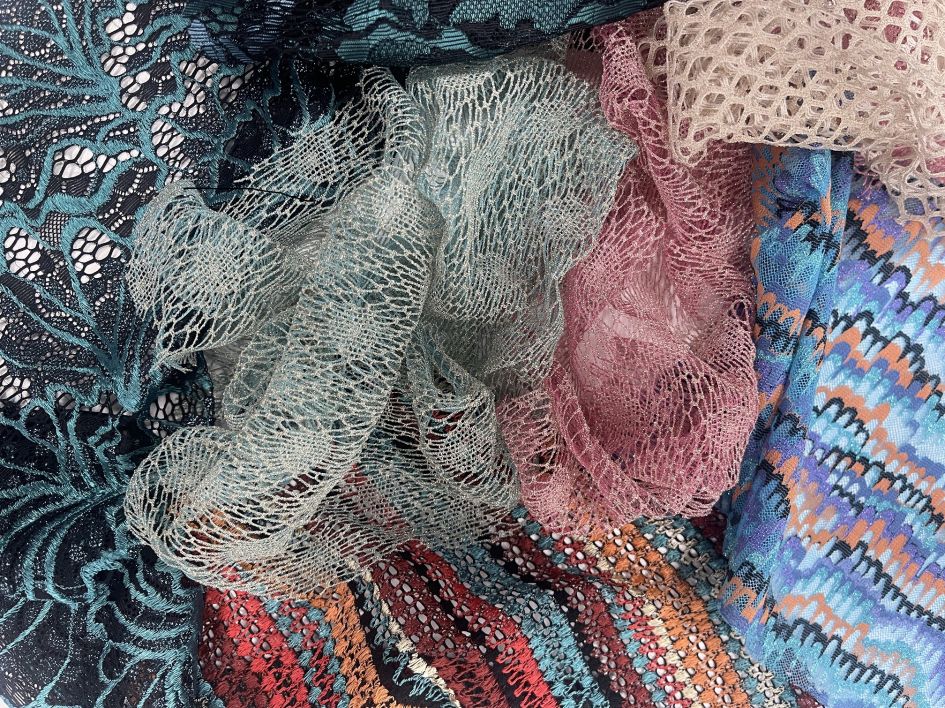 Y.E.E.S. Green Double D Nylon 6 by Ambrofibre 97: a GRS recycled polyamide in dope-dyed version, whose production does not require the use of water. From raw materials to finished products, the production chain in fact does not include the dyeing stage, reducing water usage to a minimum as the fabrics and laces only need to be pre-treated and heat-setted even during the finishing stage. In addition to ensuring high color fastness, the fiber enables the manufacturer to save 55% on water and 54% on energy per tonne of fabric and reduce CO2 and COD emissions by 52% and 34% respectively. The fiber makes its debut in lingerie with Iluna's Green Label collection in a black version, combined with pre-dyed viscose and lurex yarns for a touch of color. In addition to this novelty, the SS25 collection presents various stand out fashionable solutions: from pleats to multicolor (offered both in flounce and allover designs that create different effects in various color combinations,), to lurex netting, now also available with recycled PA. The lurex is twisted with polyester which results in a high degree of fastness, making these articles ideal as bases for printing.