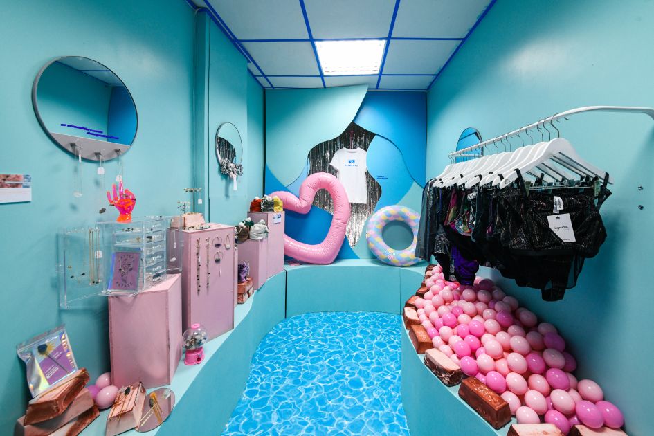 The store is based on a user experience. At Plouf we draw the parallel between going into the deep end and making decisions to see your activity grow. It is therefore natural that the store looks like a playful pool, revisited in shimmering colors and geometric patterns. Visitors buy a ticket at the counter, go through the locker room and immerse themselves in the world of exhibiting ethical brands. To live the experience, I invite you to come see us!