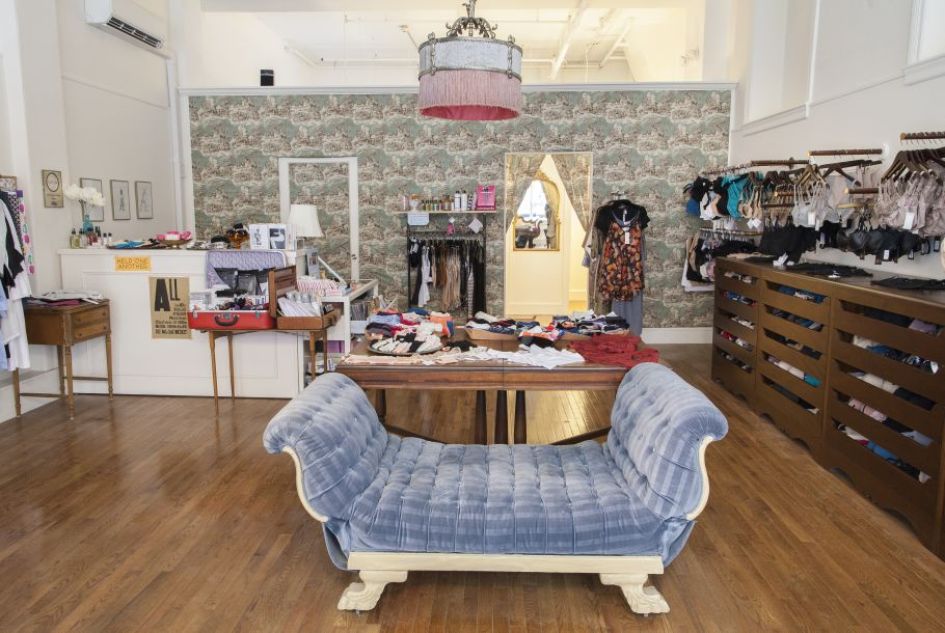 ❤ We love the rustic Maine charm that is accentuated with custom-made mahogany drawers and hanging pegs made from reclaimed balusters. Elegance is a theme that runs throughout the entire space, exemplified by an upholstered wall featuring a forest scene that instantly turns heads or the subtle touch of gold-leaf lettering that adorns the windows, all highlighted by plenty of natural light. The front of the store is reminiscent of a tasteful living room, creating an inviting and friendly environment for customers to enjoy while browsing for lingerie or accompanying a friend. The newest arrivals are carefully positioned above and around a set of custom-made drawers containing additional styles and sizes, all arranged with precision for optimal convenience. Completing the décor are custom flower arrangements made by a sustainable floral studio that periodically collaborates with the store and a display of local artwork that seamlessly blends with the aesthetic. The store prides itself not only on taking bra-fittings very seriously but also on hosting special events and collaborations, such as boudoir photo sessions for Valentine’s Day, complete with mimosas, fittings and flower crowns for a truly unforgettable experience.