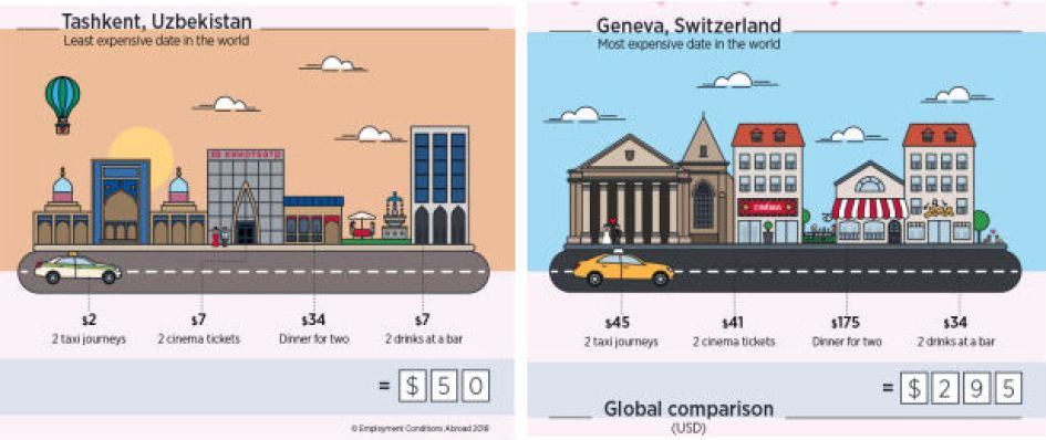 In case you're wondering, the cheapest date is in Tashkent, Uzbekistan and the heftiest price tag was attached to an evening in Geneva, Switzerland. However, the big apple, NYC, wasn't too far behind, at 225$!
