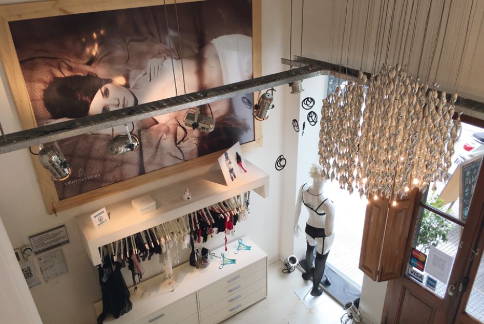 WE LOVE the fact that the store is inside an old house and has kept some of its striking original features, combining them with a more contemporary, minimalist atmosphere. The storefront combines traditional doors from the 1920s with modern glass shop windows to make their eye-catching garments stand out. The boutique's focal point is an elegant chandelier that creates an intimate and exclusive atmosphere inside. The light colored walls and furniture reinforce the store's visual identity and allow the products to take center stage. The muted color pallet draws customers’ eyes straight to the brightly colored selection of intimates, inviting them to reach out and touch the products on display. Dramatic framed pictures on the wall give the space an atmosphere almost similar to an art gallery and reinforce the exclusive atmosphere inside the store. A particular highlight of the store is its fantastic location, situated in the chic "Palermo Hollywood" area of Buenos Aires alongside designer stores and the city's best restaurants.